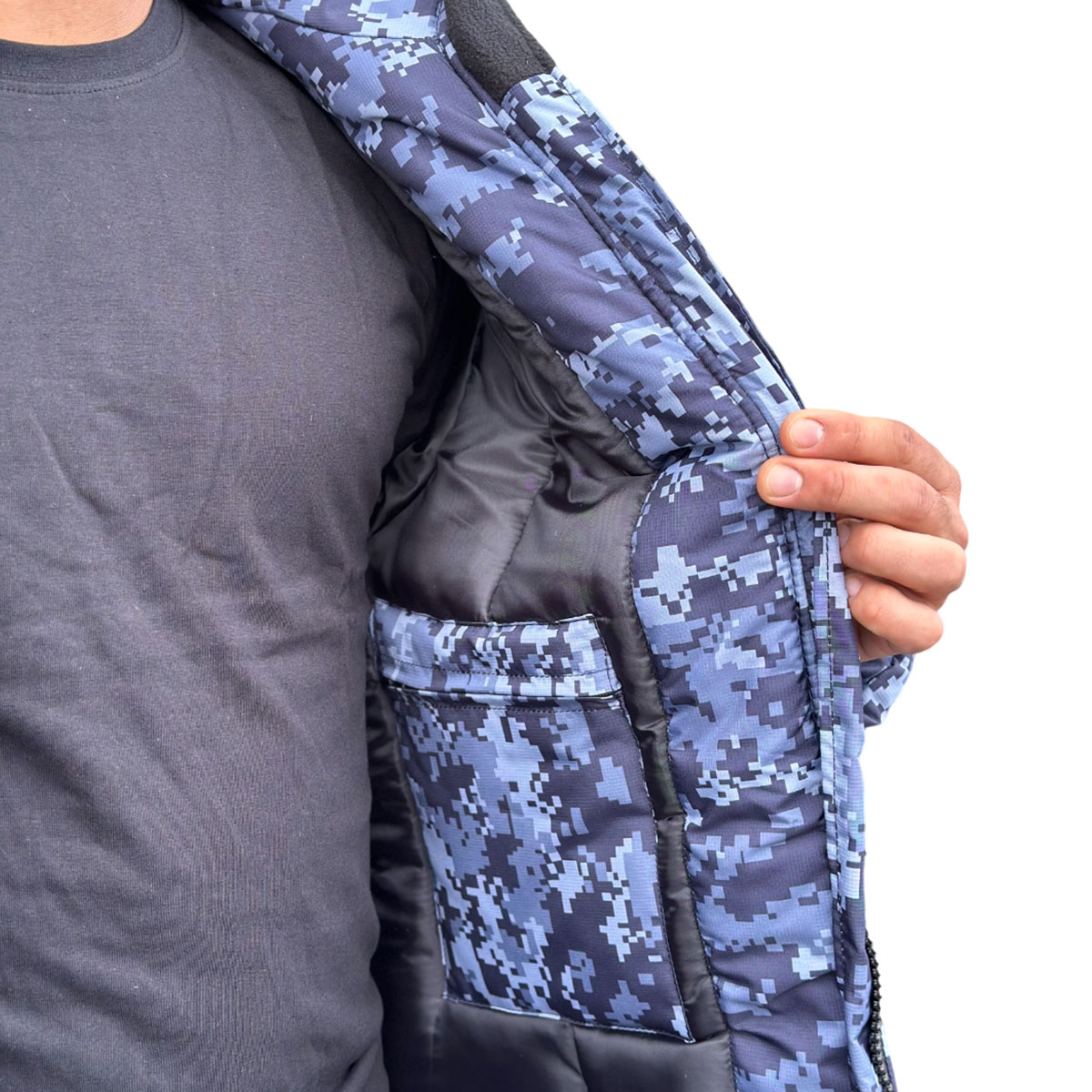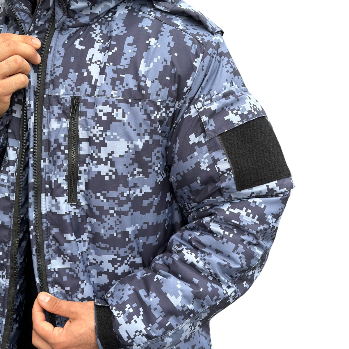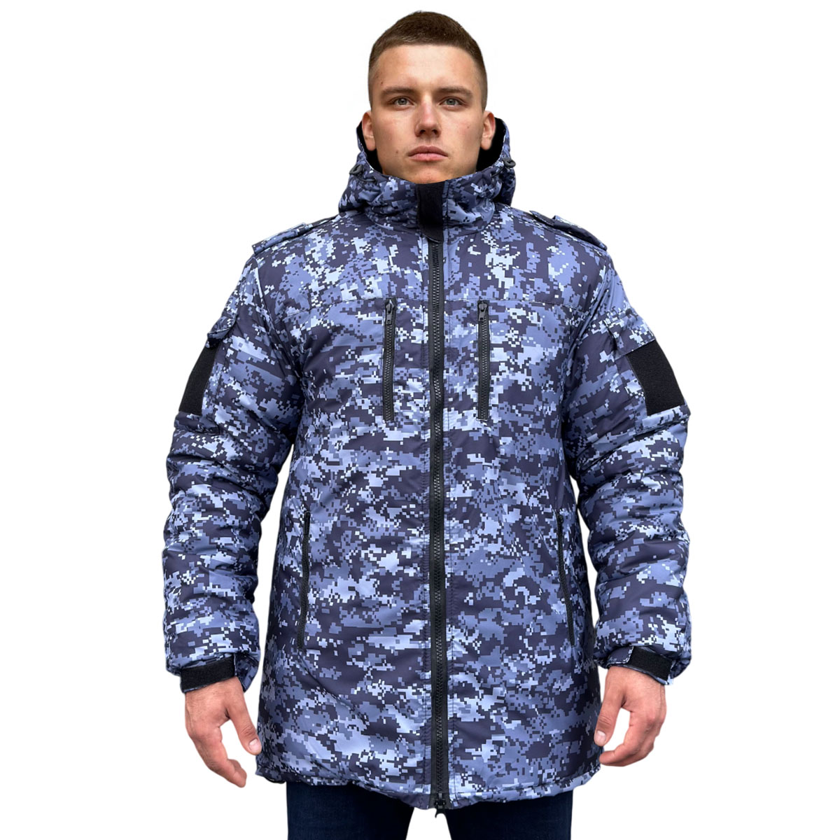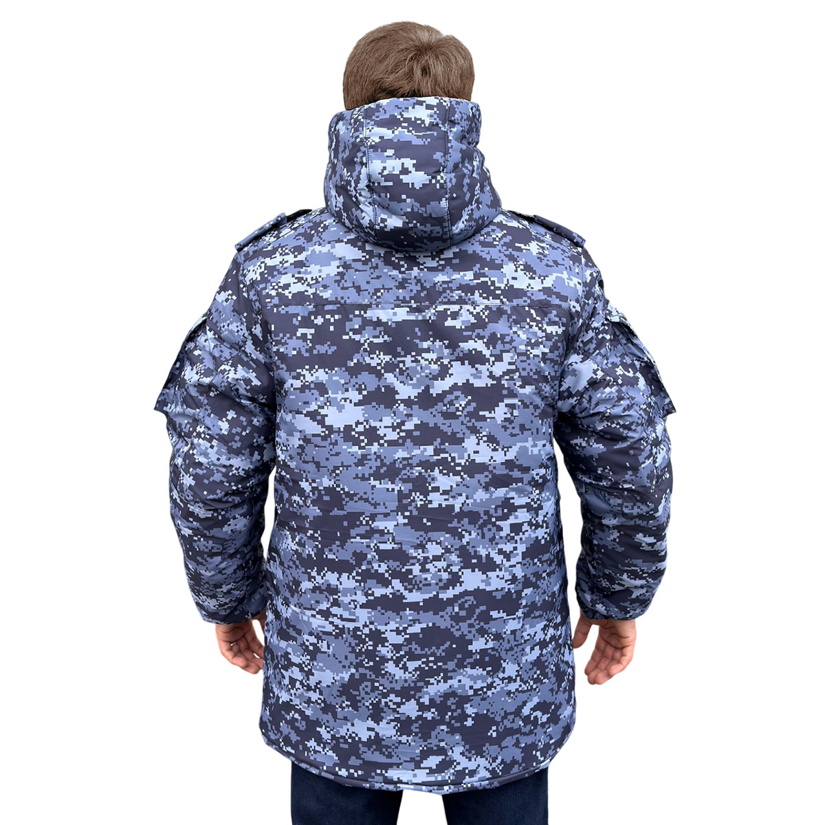Бушлат зимний для сотрудников РОСГВАРДИИ, в расцветке "синяя точка". Ткань верха: микрорип стоп - мембрана.Утеплитель: холофайбер. . . Прорезные карманы на груди на замке молнии. На карманах нашиты липучки для крепления нашивок и шевронов, спинка без липучки. Накладные карманы на рукавах с клапанами на липучке велкро. На плечевых швах имеются фальш погоны на липучке. Потайной накладной карман на молнии. Капюшон с регулировкой по объёму при помощи утягивающей кулиски. Рукава регулируются по объёму при помощи липучки велкро.