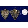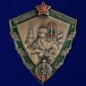 Сувенирный знак в виде щита, на котором изображен пограничник на фоне пограничного столба и башни Кремля. Верху красная звезда в середине надписи: "Отличный пограничник", внизу щит с надписью: МВД.